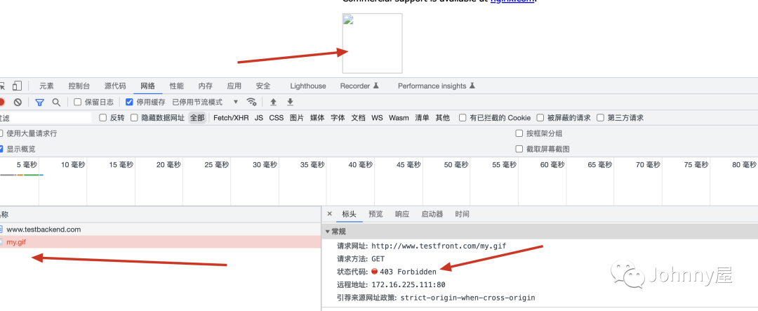 此时再访问 www.testbackend.com 去引用 www.testfront.com 的资源 就不能访问了