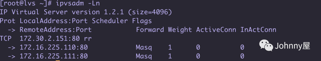 [root@lvs ~] ipvsadm -a -t 172.30.2.151:80:80 -r 172.16.225.111 -m再次查看 可以看到配置如下
