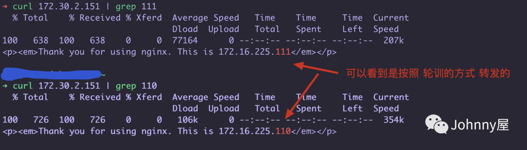 简单的 curl 测试一下 : 可以看到效果已经出来了 我们访问了 172.30.2.151 这个 vip 轮训路由到后端2台真实服务器的nginx了