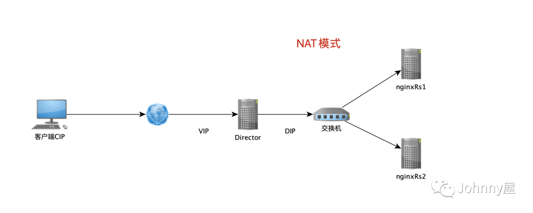 NAT 模式(即:网络地址映射)其工作原理是:客户端访问LVS时,LVS通过重写请求报文的目标地址,且根据预设的调度算法,将请求分派给后端真实服务器,真实服务器接收到请求处理后,发出响应报文也需要通过LVS返回,返回时需要修改报文的源地址,然后返回给客户,完成整个负载调度过程