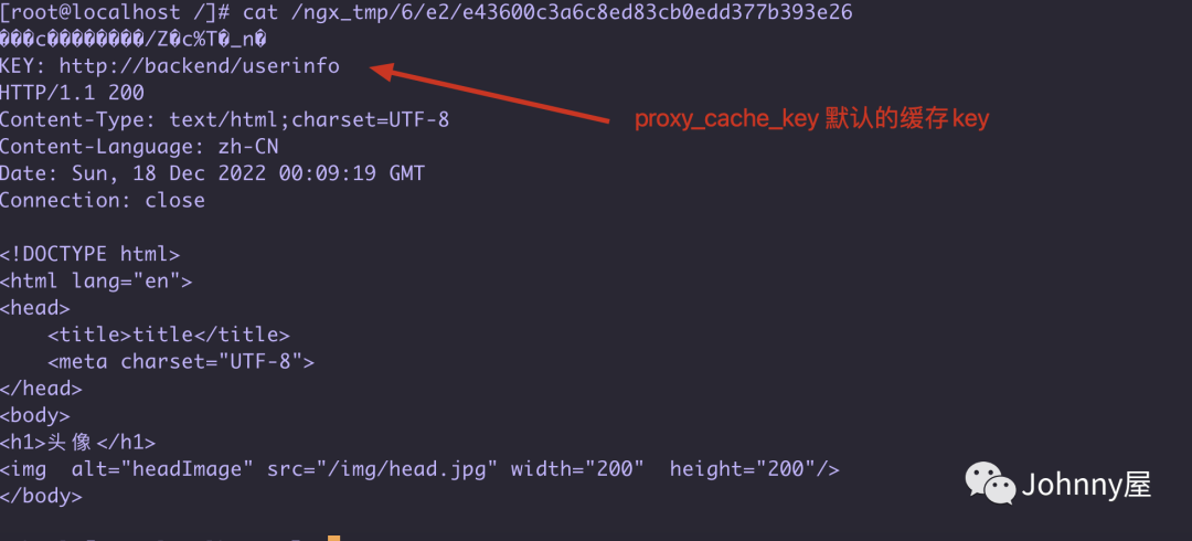 找到html的缓存内容可以看到 有个KEY:表示这个默认的 proxy_cache_key 这个是可以配置的, 可以配置用什么去作为key 缓存, 默认$scheme$proxy_host$request_uri 其实这里有个问题 因为默认的key 带 scheme 就是http和https 还有 proxy_host 这些当 http 和 https 两个访问的时候 会导致2次请求并且缓存2分相同数据, 因为key不同 但是内容相同, 这个肯定是不希望看到的, 可以只定义 proxy_cache_key 是uri 后缀即可